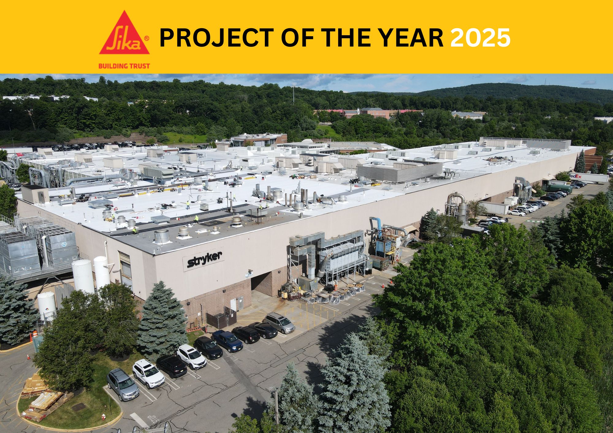 Each roof area was detailed with new three-piece Kynar 500® coated edge metals, termination bars, and precision counterflashings, ensuring long-term protection in line with Sika Sarnafil’s 20-year NDL (No Dollar Limit) warranty. Tri-State maintained rigorous quality control throughout the project. As a licensed Sarnafil contractor, all installers were trained to manufacturer standards, and the team provided daily photo-documented progress reports to Stryker. Dedicated supervision — including a project supervisor, foreman, and safety manager — ensured that the work was executed with the highest levels of safety and professionalism. Equally as important, Tri-State completed the project without disrupting Stryker’s daily operations. Employees, visitors, and facility managers experienced no interruptions while the roofing systems above them were being upgraded.